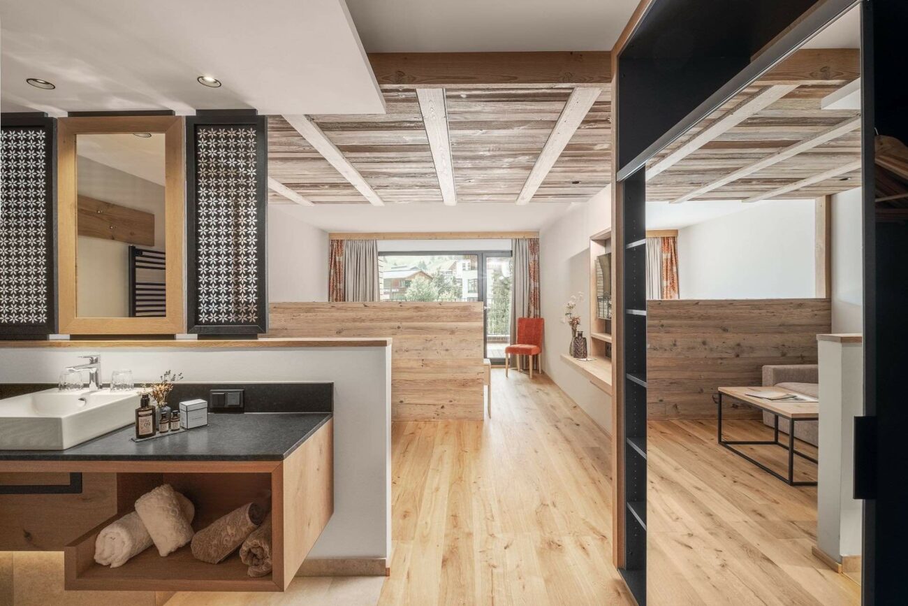 Warme Farben und viel Holz prägen die einzigartige Ausstattung und passen zum überwältigenden Bergpanorama.