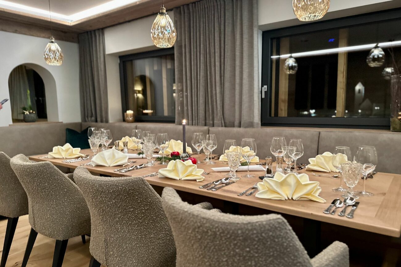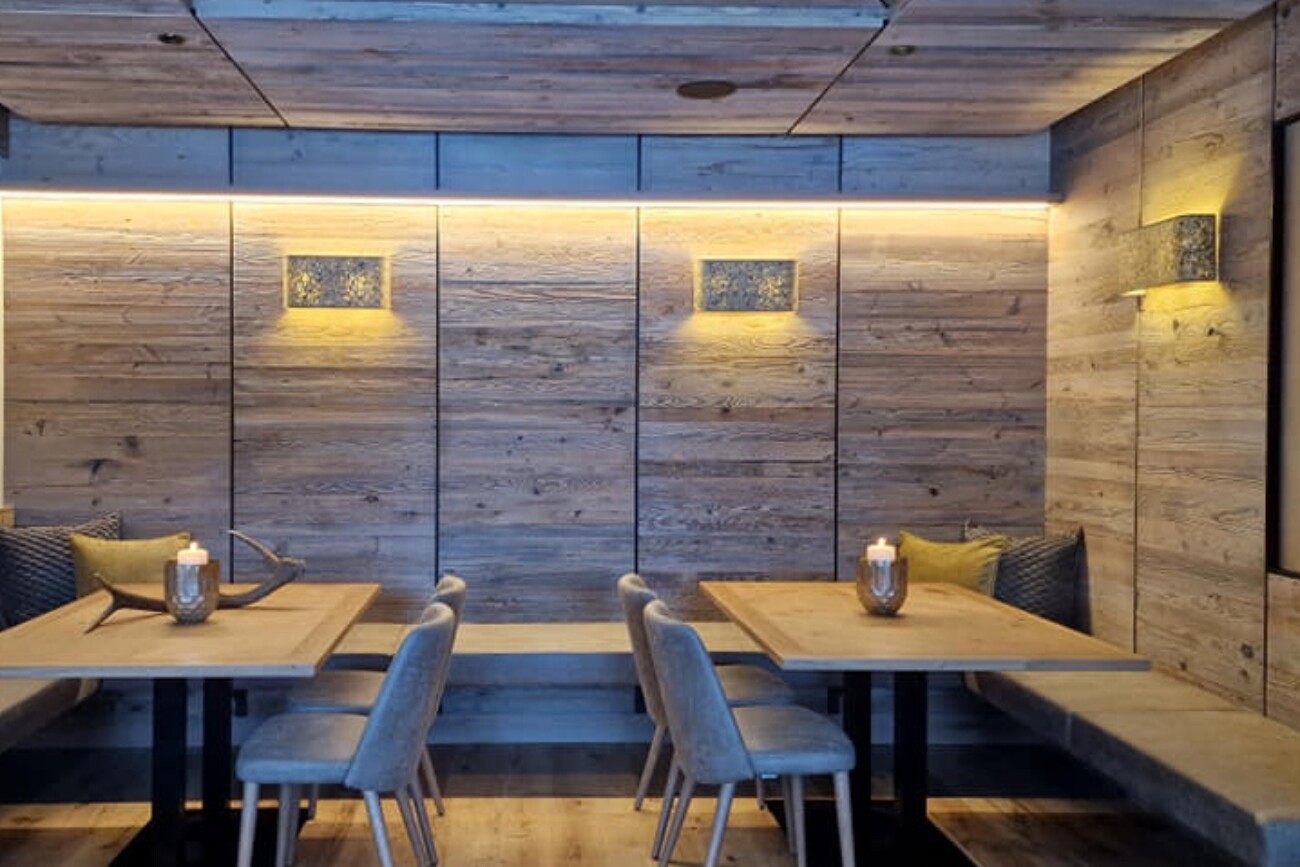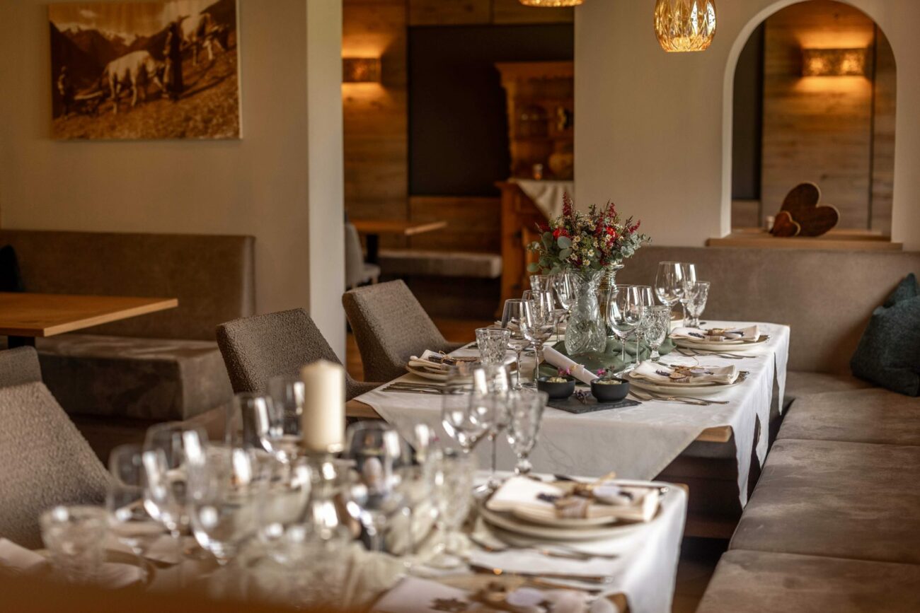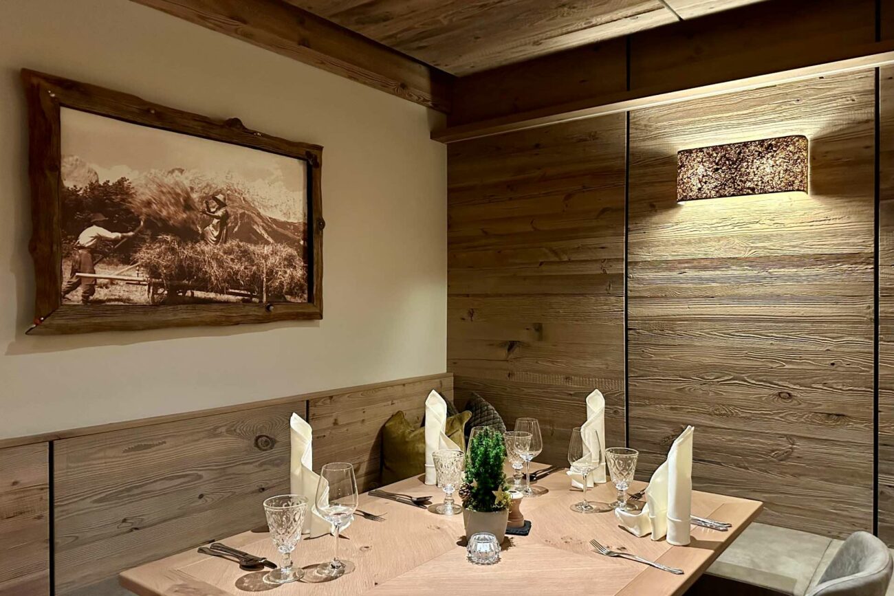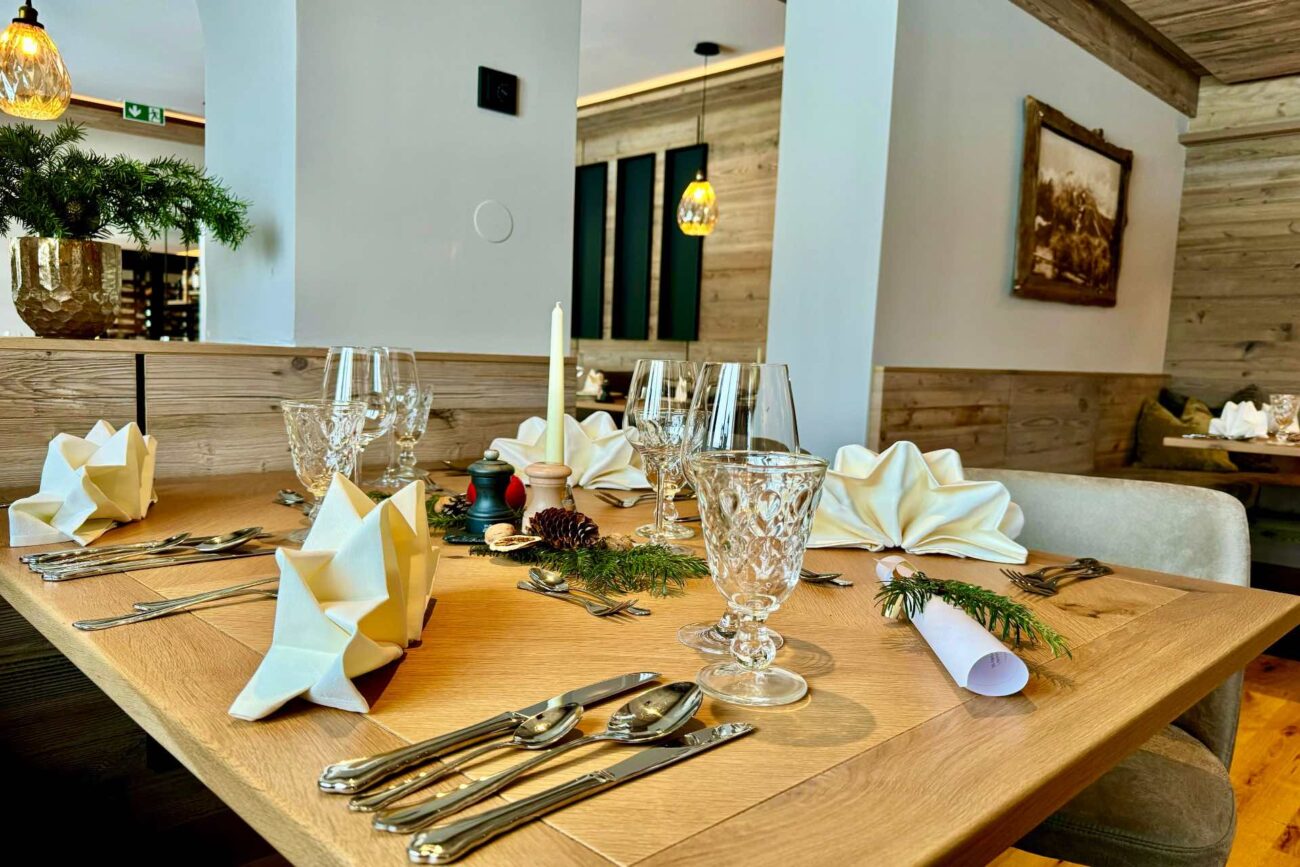Das Ambiente des Restaurants ist ebenso beeindruckend und gemütlich wie das Essen selbst: Von jedem Platz aus bietet sich ein atemberaubender Ausblick auf die umliegende Berglandschaft, der das Genusserlebnis noch intensiviert. Die harmonische Verbindung von traditioneller Gemütlichkeit und zeitgemäßem Design schafft eine einladende Atmosphäre, die zum Verweilen einlädt.